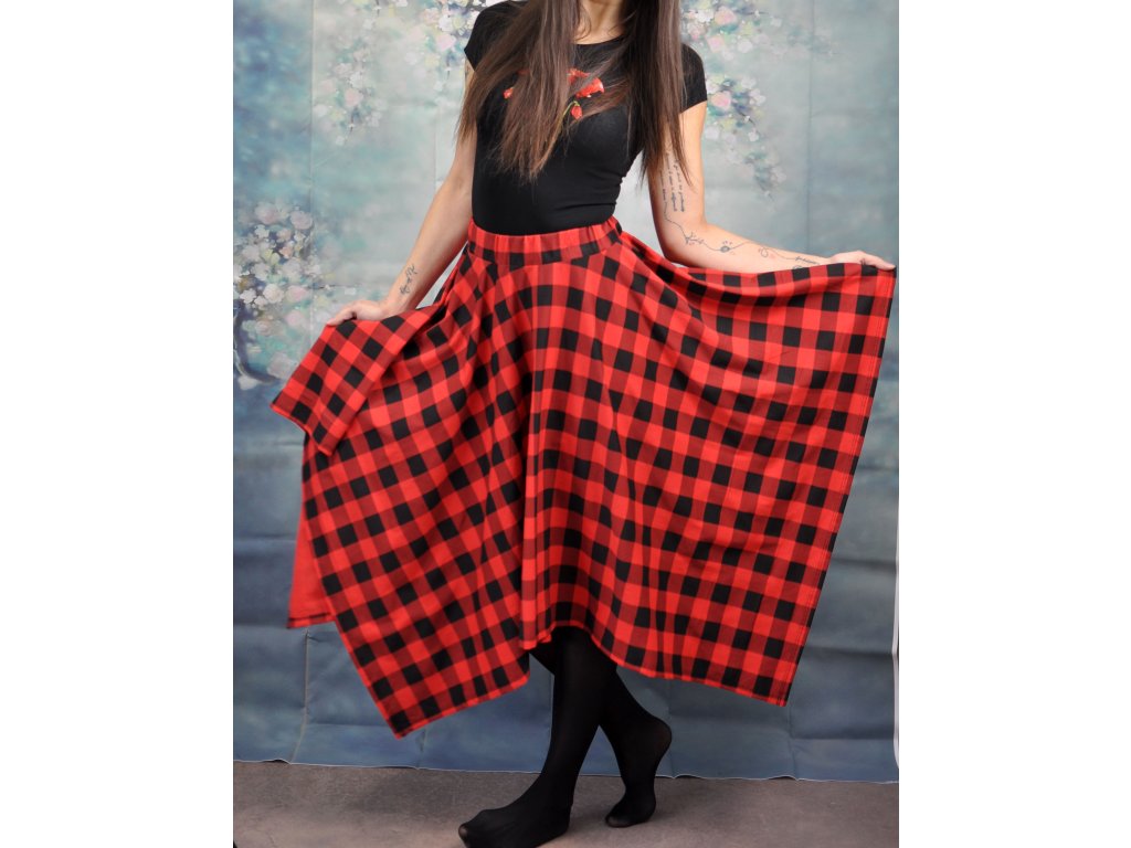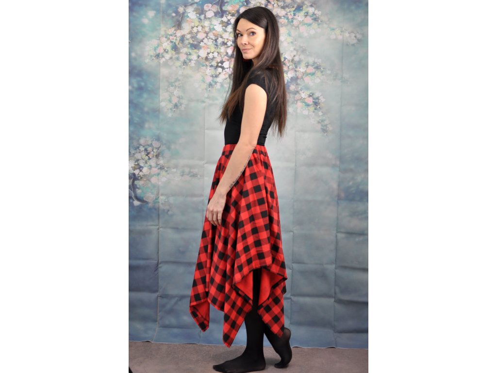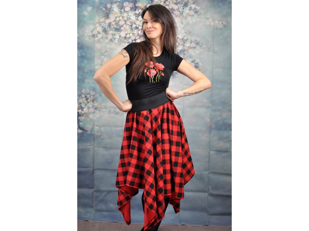 Dámska sukňa asymetrického strihu s červeným károm - štvorcová