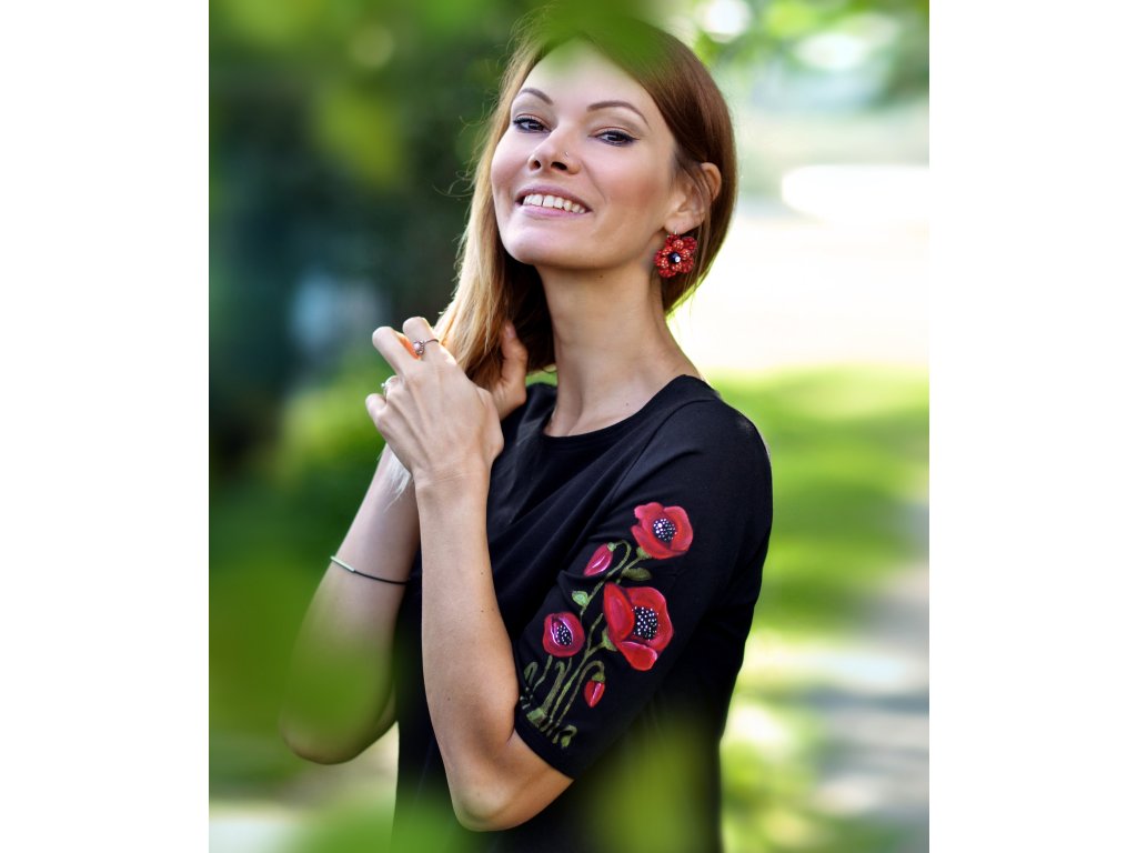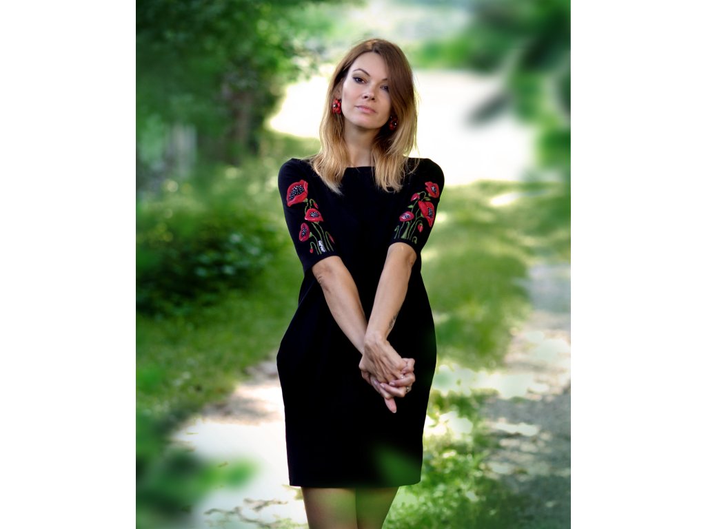 Pohodlné čierne šaty s vreckami z bavlneného úpletu doplnené ručnou maľbou
