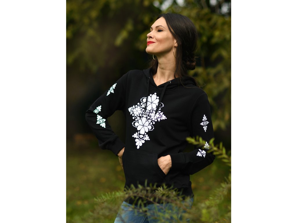 Čierna mikina s autorskou aplikáciou vo forme bieleho ornamentu