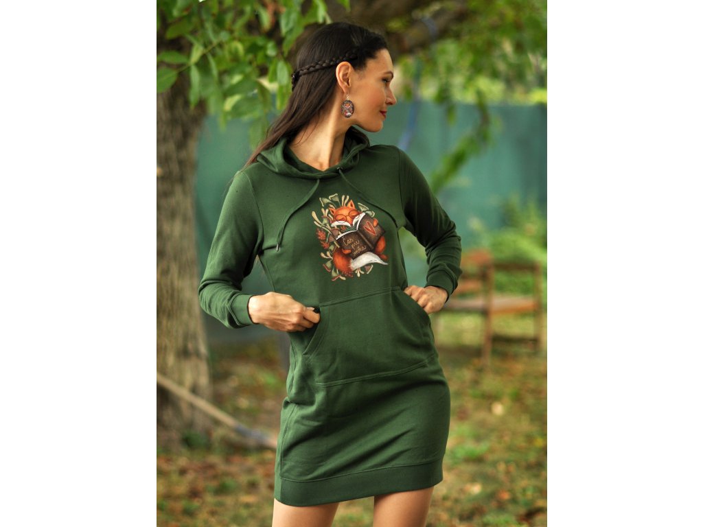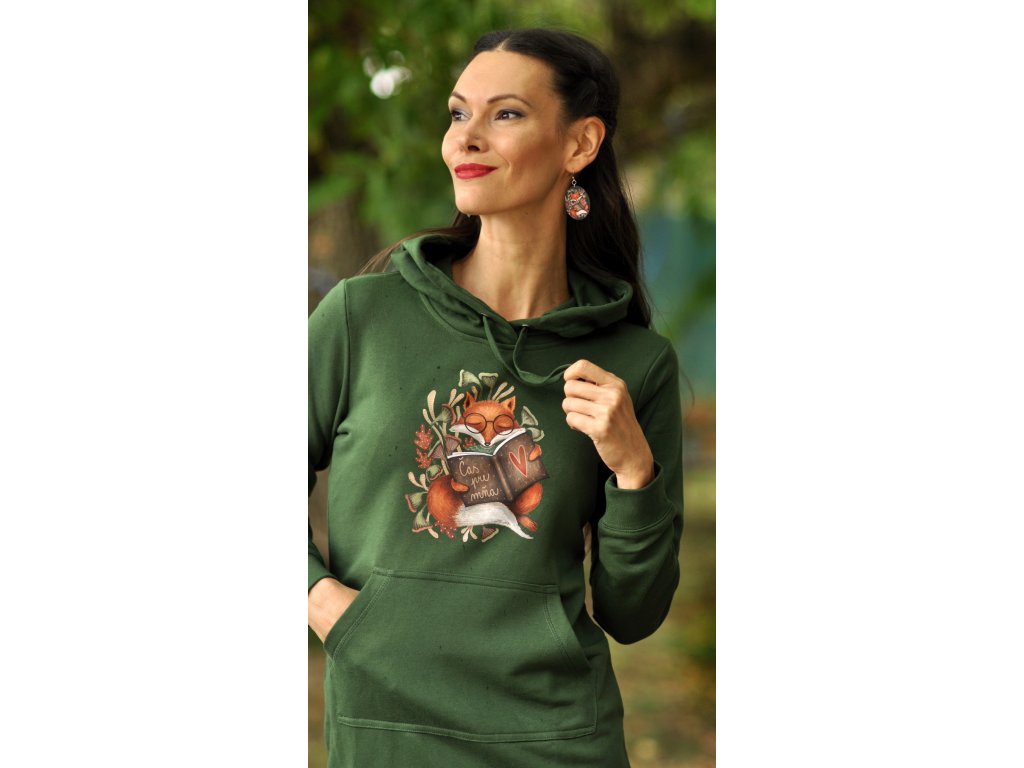 Zelené mikinošaty s kapucňou a autorskou potlačou líšky - ilustráciou čas pre mňa