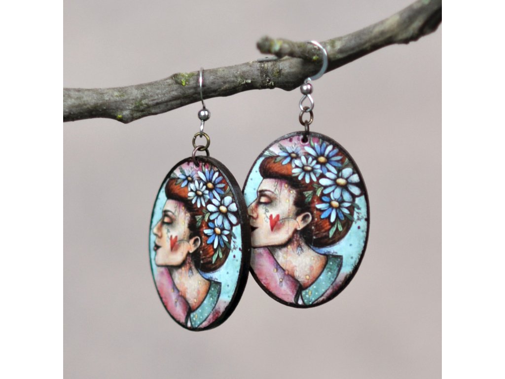 Drevené náušnice s aplikovaným pôvodným autorským motívom.