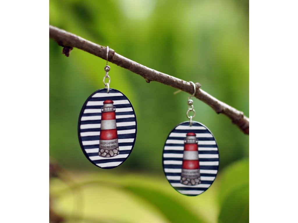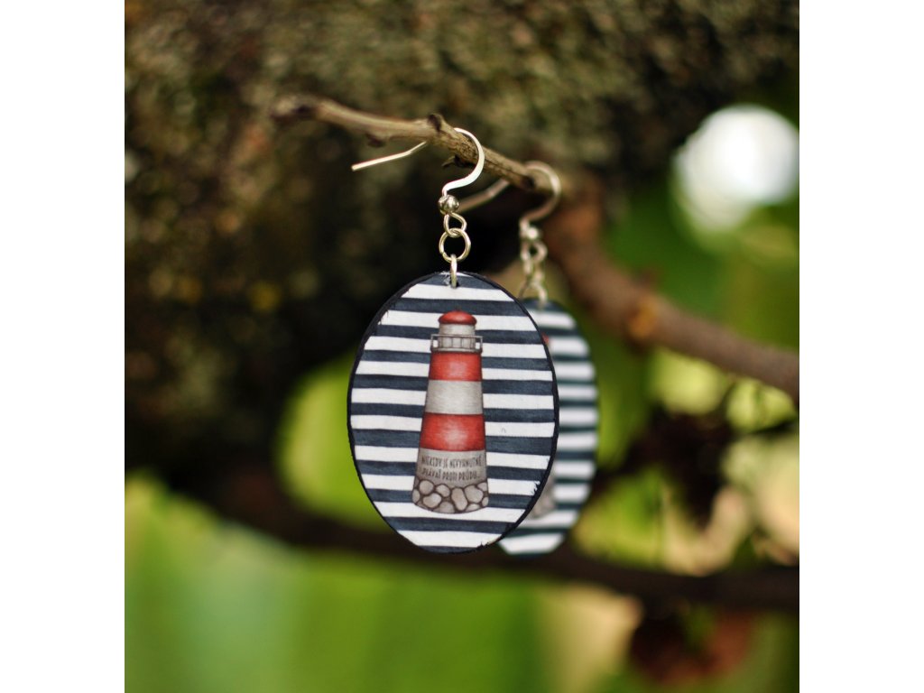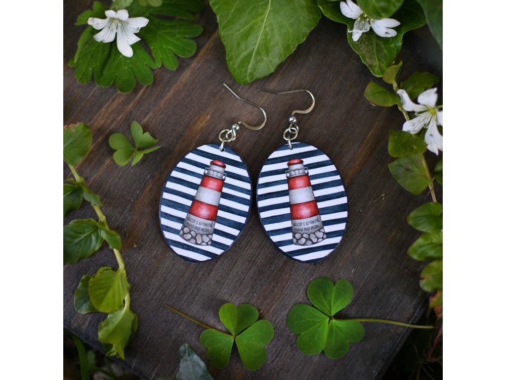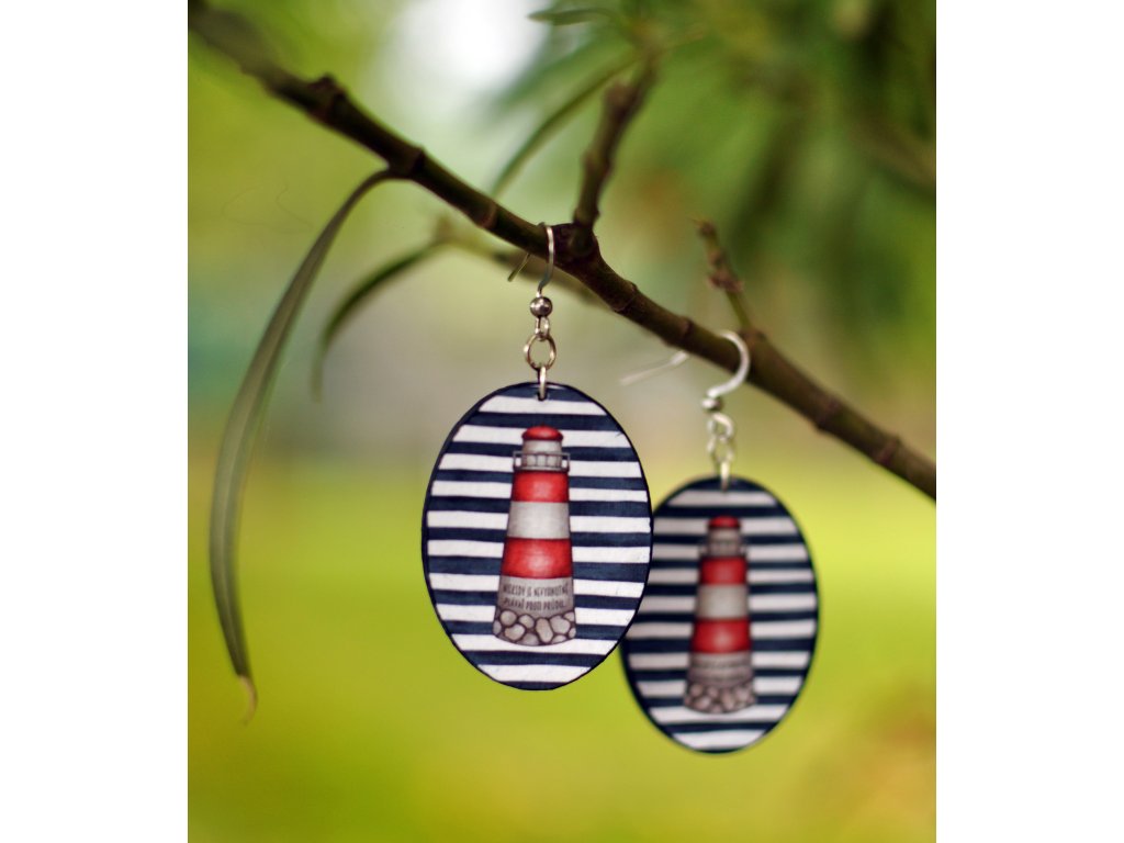 Drevené náušnice s aplikovaným pôvodnou autorskou ilustráciou s námorníckym motívom.