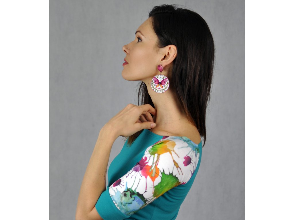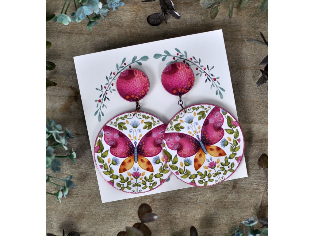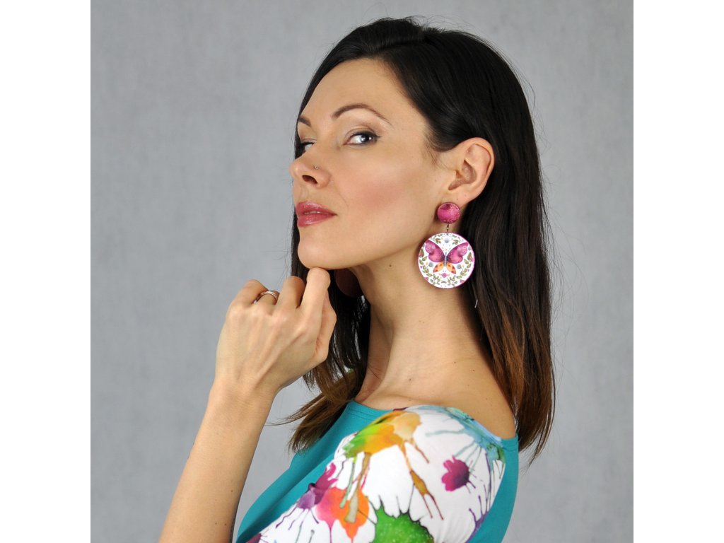 Drevené náušnice s aplikovaným pôvodnou autorskou ilustráciou Motýlí. Zadná strana je ručne maľovaná akrylovou farbou.