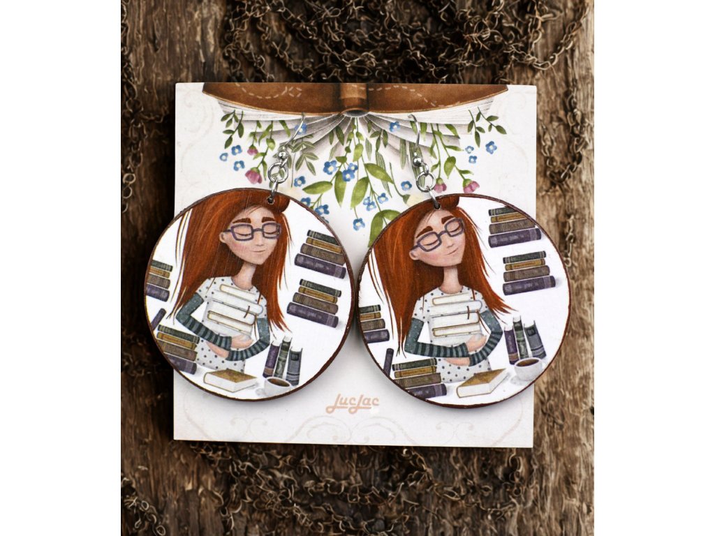 Drevené náušnice s aplikovaným pôvodným autorskou ilustráciou Knihomoľka Zuzanka