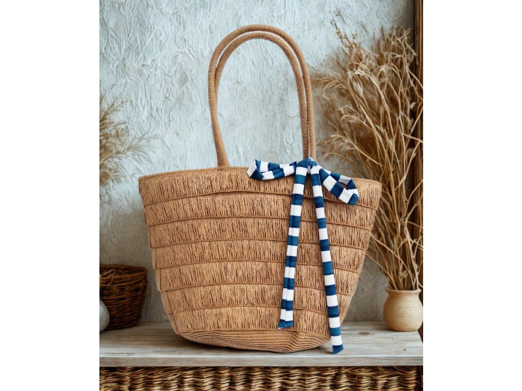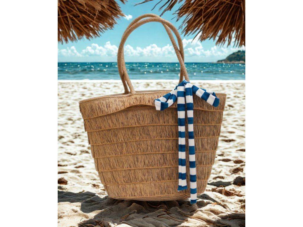 Celá je ozdobená strapcami , ktoré sú zošité z oboch strán, aby boli pevné. Tašku vynosíte k vode, na pláž, ale pokojne aj do mesta, na nákup a na ďalšie voľnočasové aktivity.