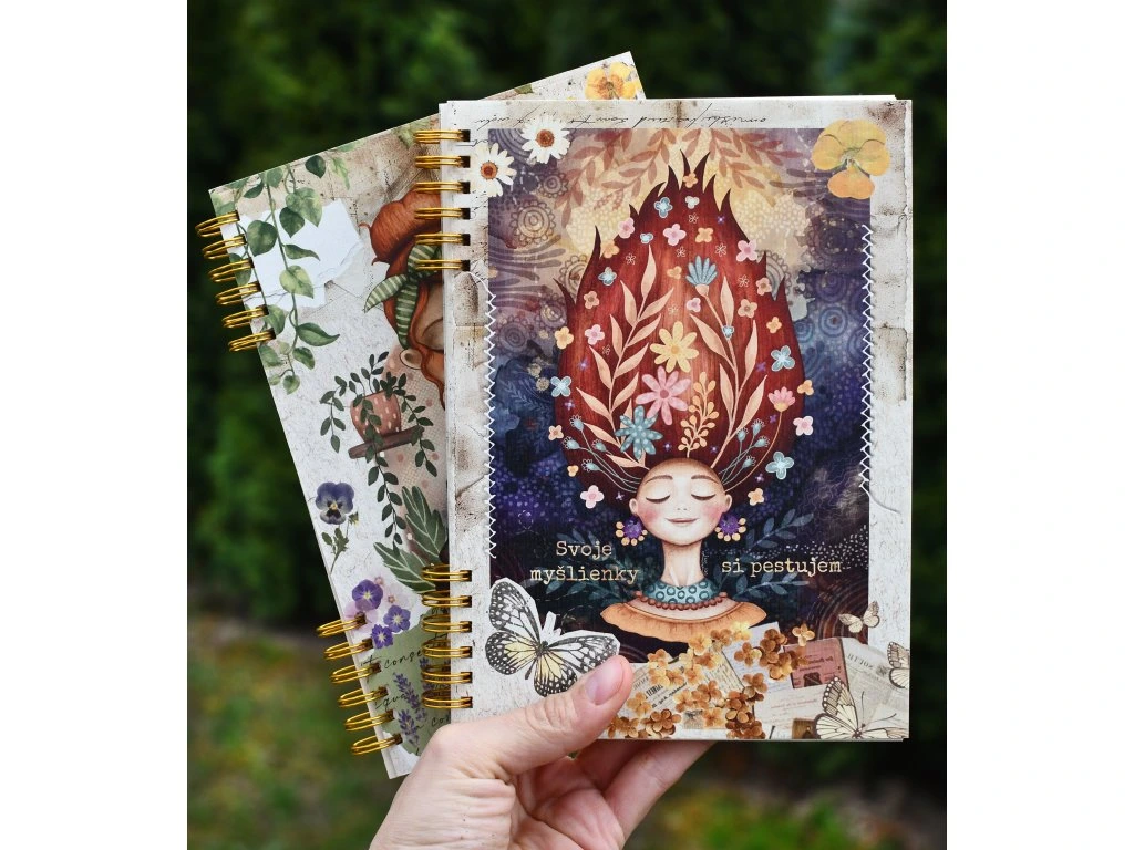 Viazaný je kovovou špirálou v zlatej farbe a na obale je moja autorská ilustrácia Myšlienky ;)