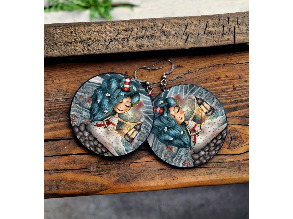 Drevené náušnice s autorskou ilustráciou Svetluška. Priemer je 5 cm
