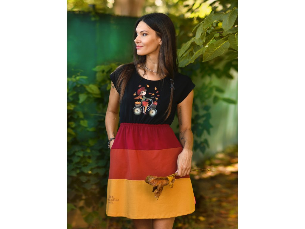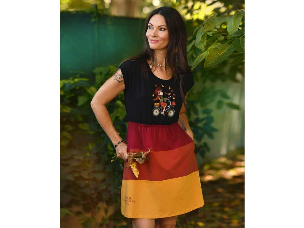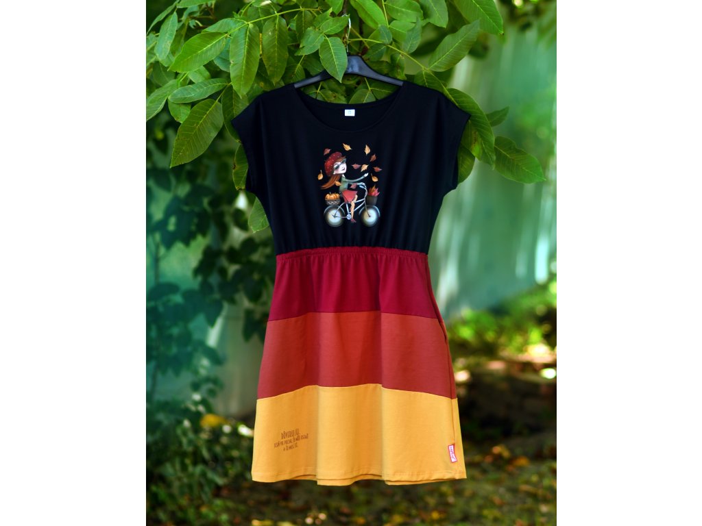 Krásne pohodlné šaty v jesenných farbách a autorskou ilustráciou Jesenná jazda