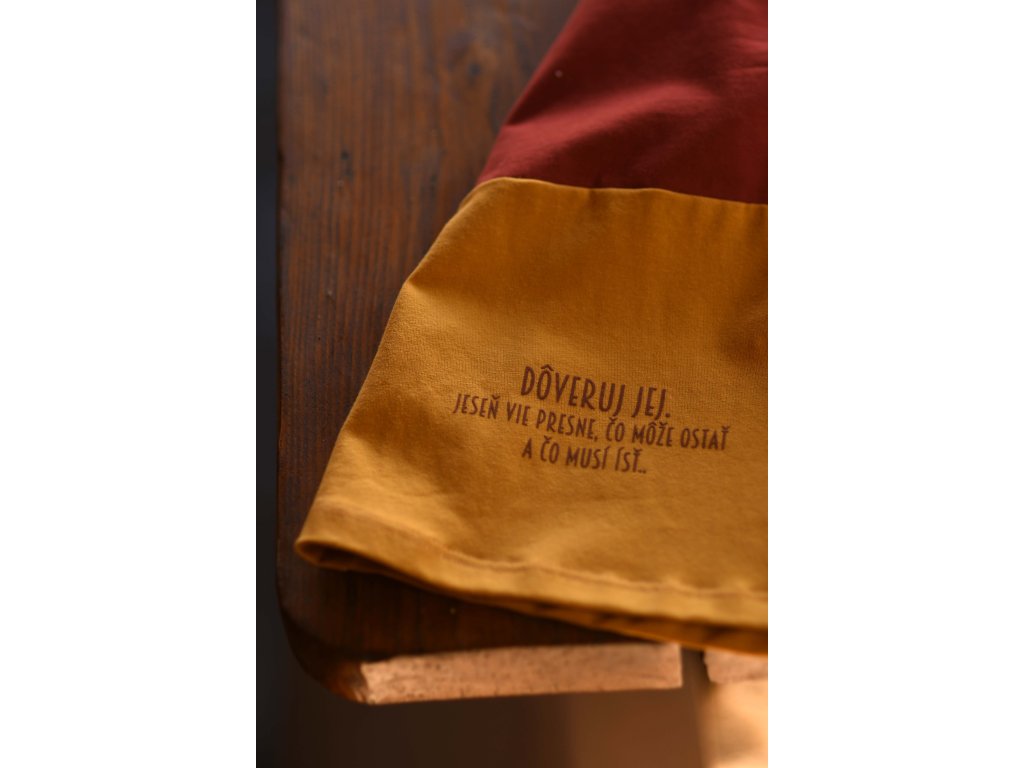 Šaty sú doplnené aj textom na spodnej časti "Dôveruj jej. Jeseň vie presne, čo môže ostať a čo musí ísť"