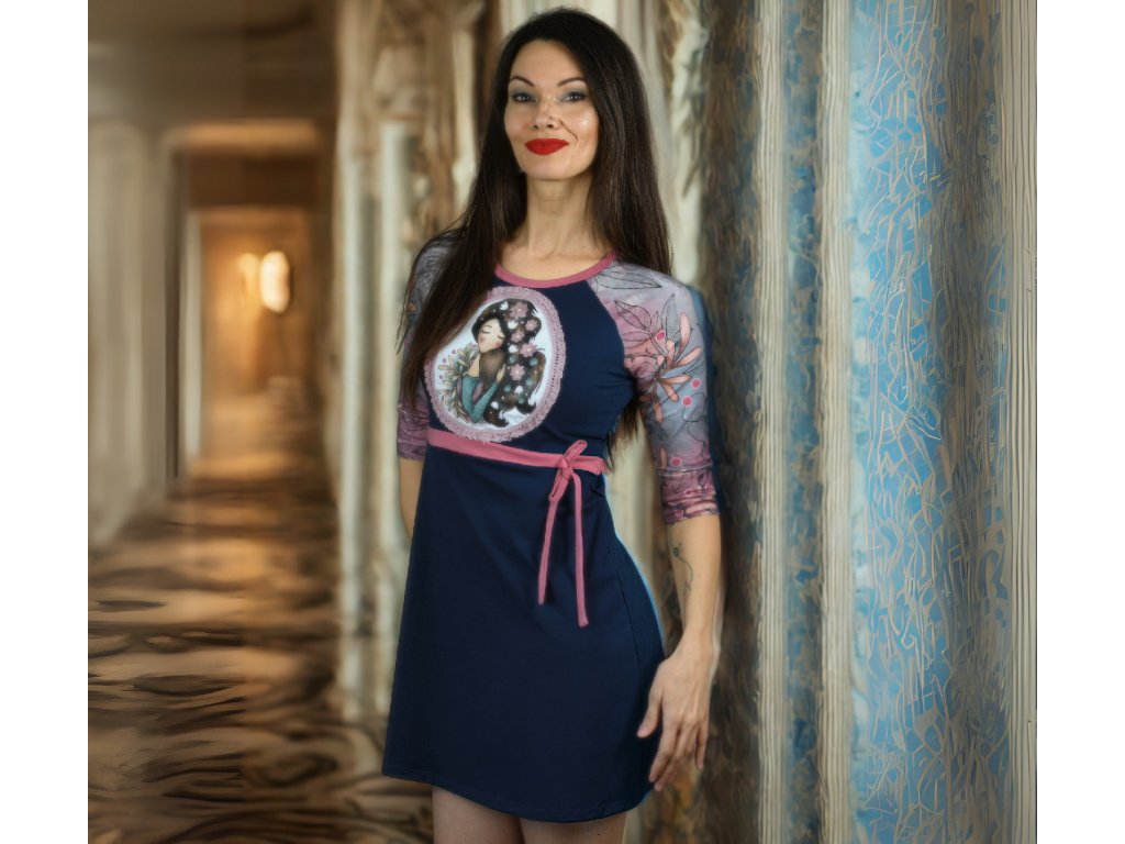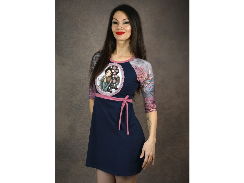 Šaty sú ušité z úpletu bavlna/elastan 95/5% v tmavomodrej farbe a doplnené rukávmi s autorským dizajnom - úpletu bavlna/elastan 95/5%