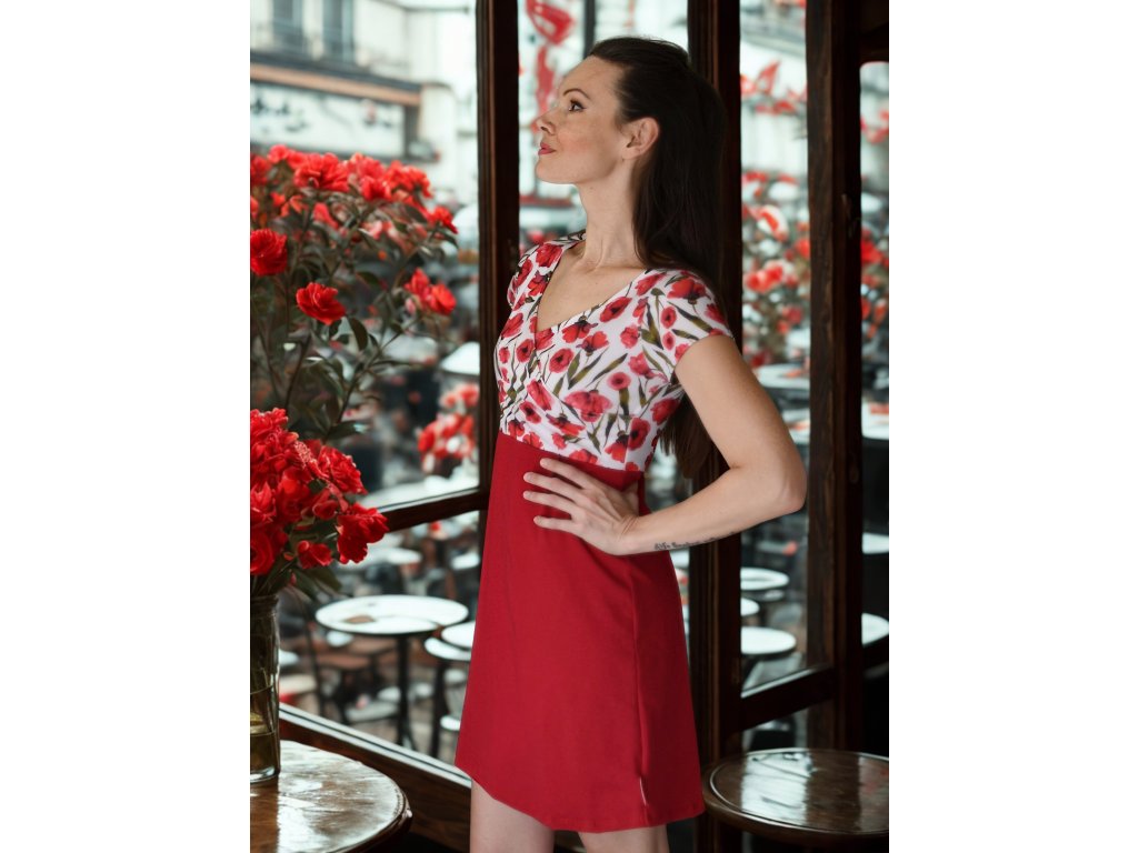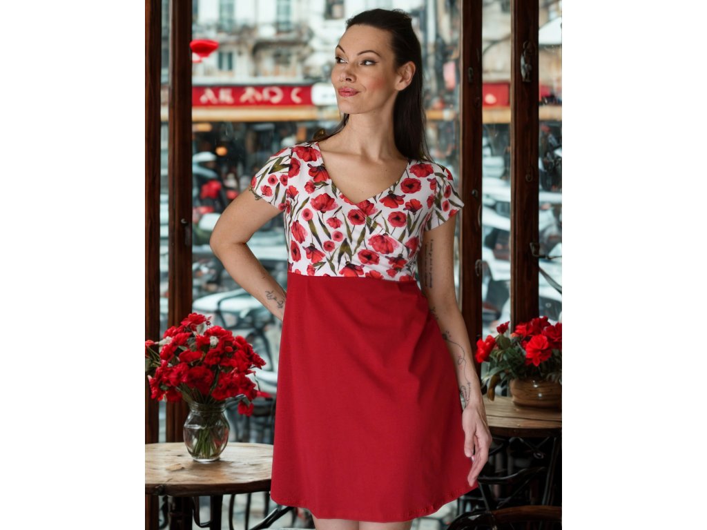 Elegantný tmavočervený úplet kombinovaný s našou autorskou látkou s dizajnom vlčích makov