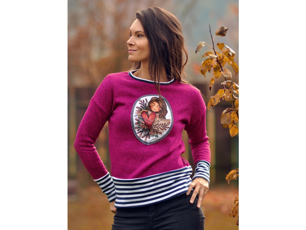 Krásny malinový (ružovočervený) svetrík s aplikovanou autorskou ilustráciou Zo srdca