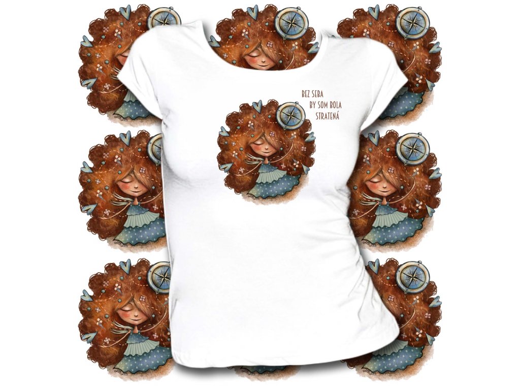 Autorský obrázok Bez seba aplikovaný na tričko.