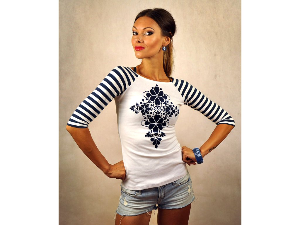 Trojštvrťové pásikavé rukávy krásne ladia s autorským ornamentom v štýle folk. Modrobiela