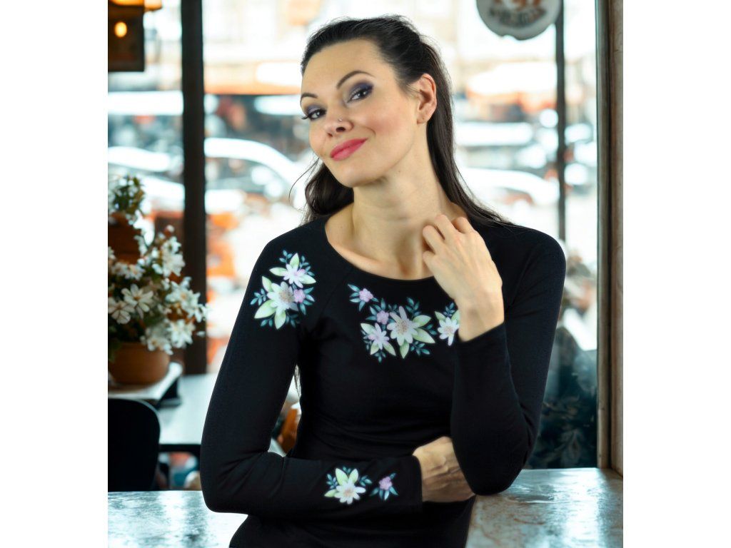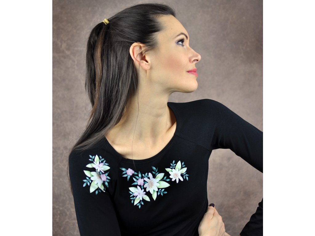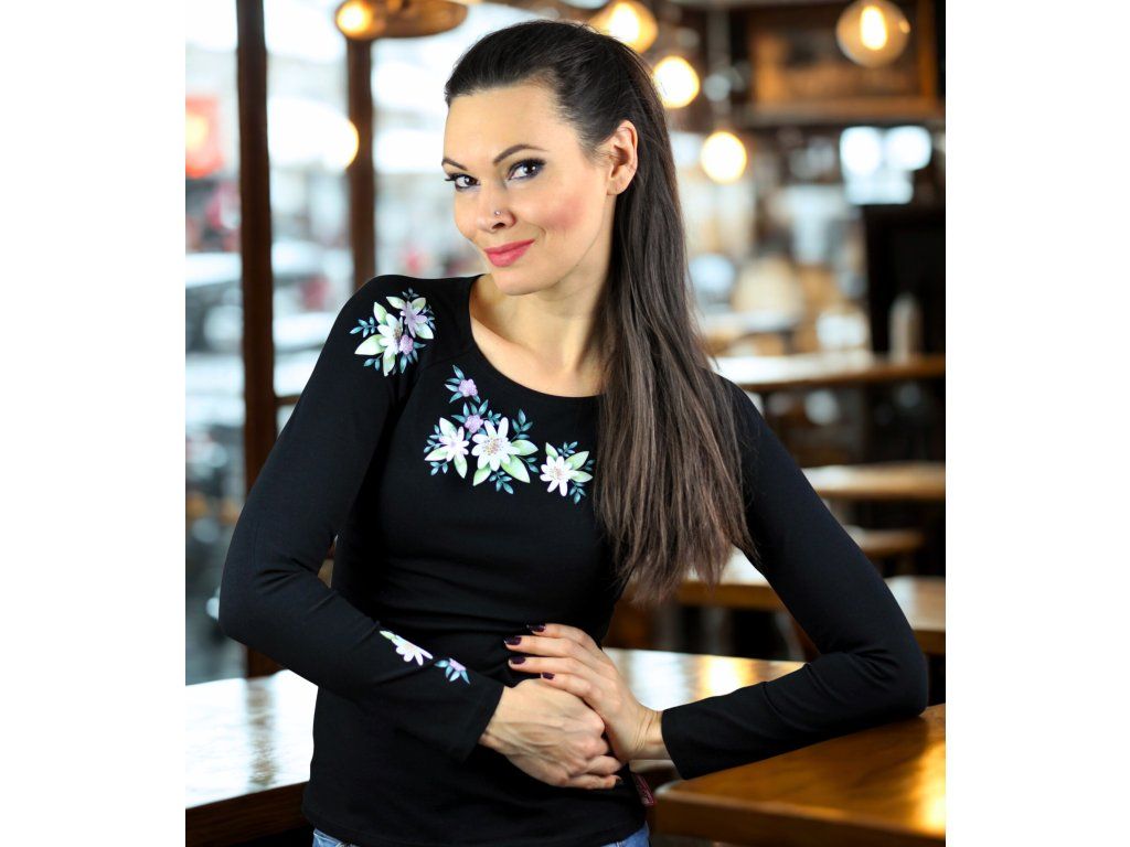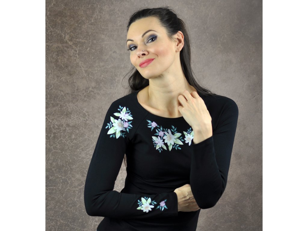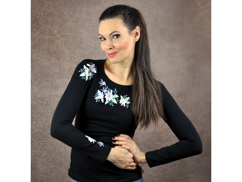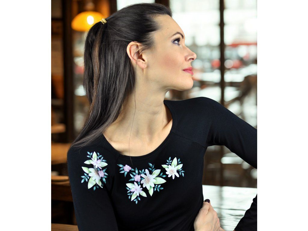Zahaľte sa do elegancie a sofistikovanosti s našim tričkom ELEGANCE. Toto čierne dámske tričko s dlhým rukávom v raglánovom strihu je ozdobené autorskou ilustráciou kvetín, ktorá pridáva nádych prírody a umenia k vášmu každodennému outfitu.