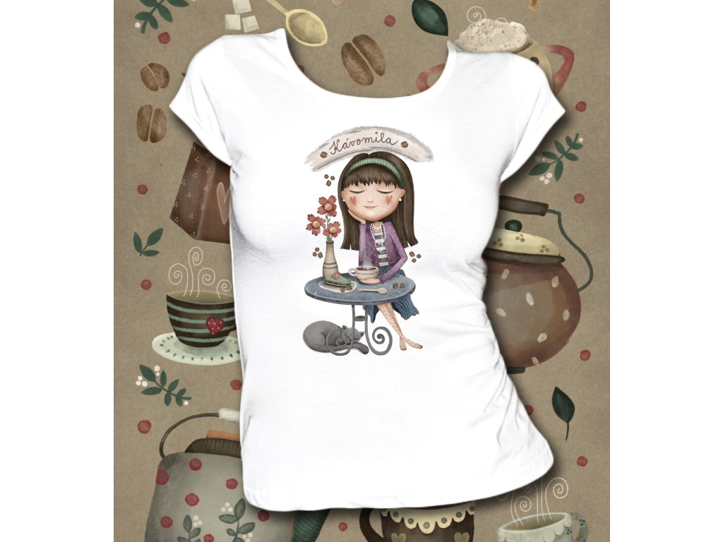Autorský obrázok Kávomila aplikovaný na tričko.