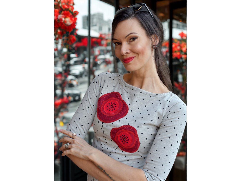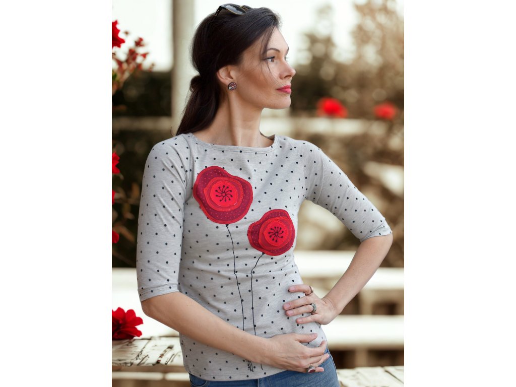 Šedé bodkovné tričko s aplikáciou vlčích makov.