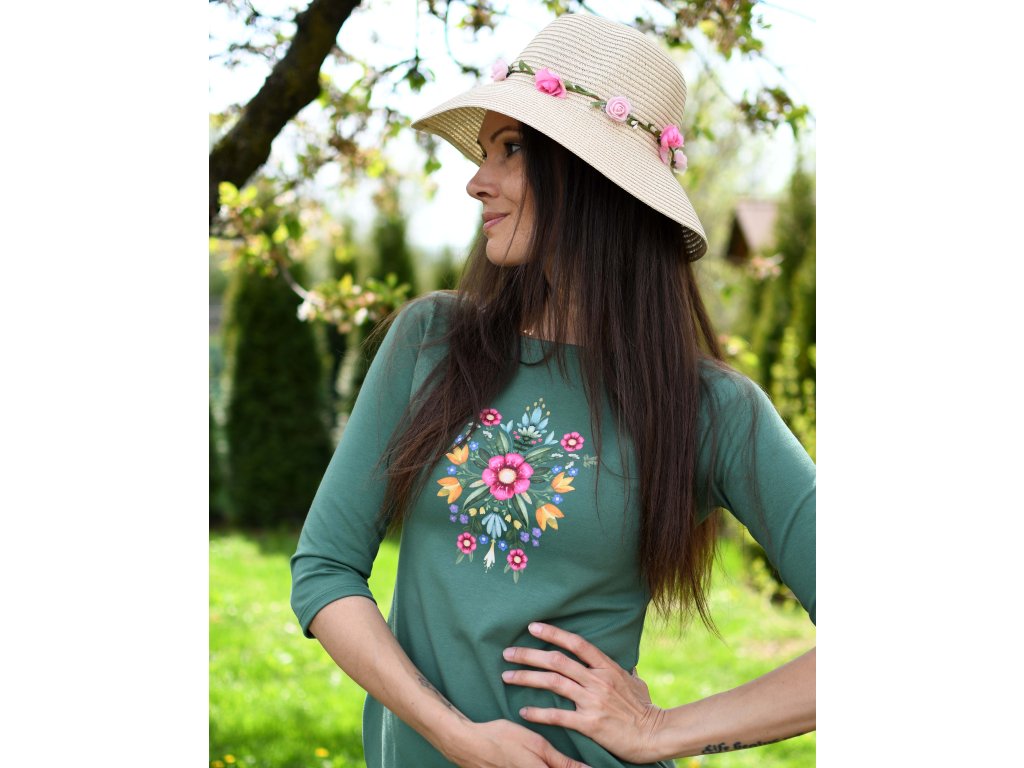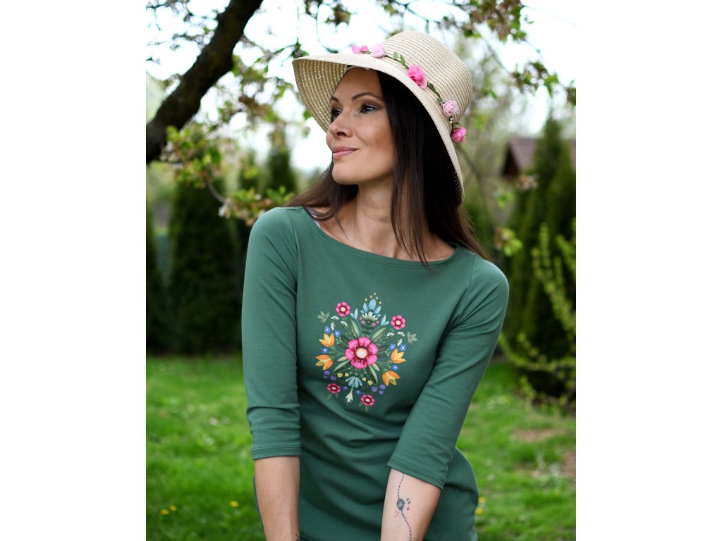 Šaty sú dozdobené kvetinovou autorskou ilustráciou vo forme potlače